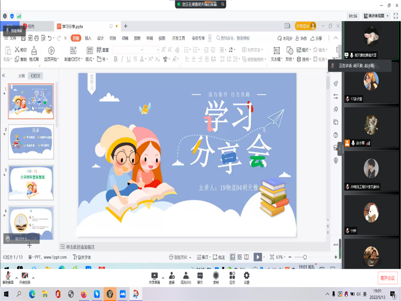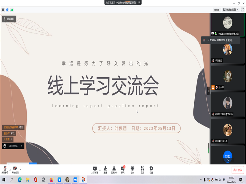 分享会开始,19级物流04班胡天雅、物流02班叶俊翔同学首先分享了自己在防疫管控下的生活作息,提醒同学们疫情期间不忘学习,合理作息,随后介绍了自己的学习、考研规划,和职业规划,给同学们提供了大致的未来发展方向并建议同学们秉持正确的学习态度,树立“只有努力才可能拥有幸福”的奋斗意识。接着19级电商01班张文彦同学分享了自己的学习方法,要有坚定的意志,积极的心态,同时充分认识自己的不足,重视回顾复盘。三位同学的精彩分享给予了同学们莫大的鼓励,让同学们更有信心地面对挑战和困难。
