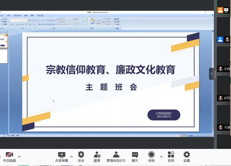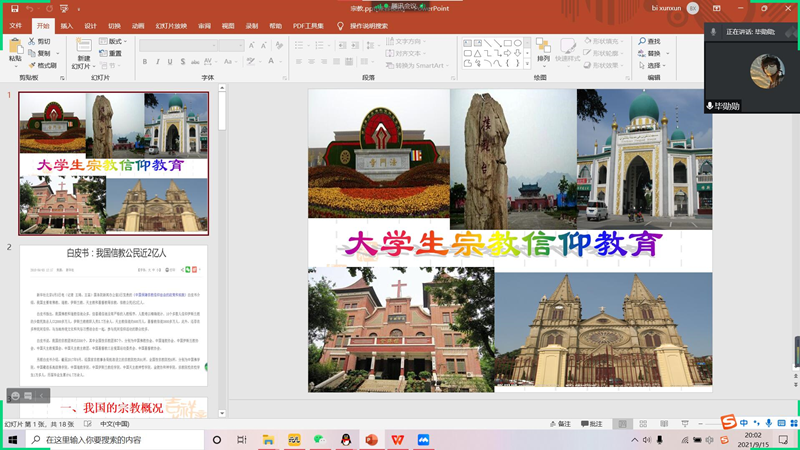 青年人是社会主义的接班人,是注入时代发展的新鲜血液。为了引导新生树立正确的宗教观、人生观、价值观,更好地了解新生的心理状况、精神面貌,提高同学们对国家宗教政策的认识,9月15日晚7:30,太阳集团tyc234cc进行了线上宗教政策宣讲主题班会,20级代班以及21级全体新生参加了本次会议。