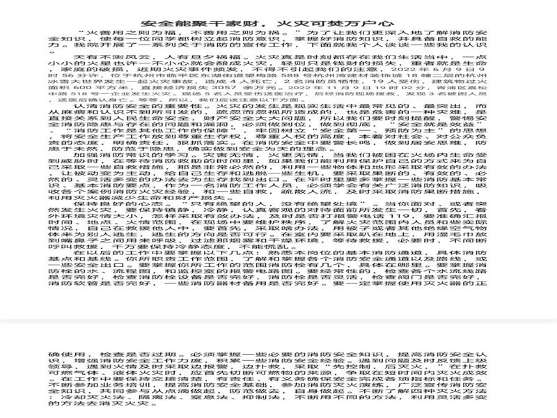 “隐患险于明火,防范胜于救灾,责任重于泰山”。此次主题征文大赛的举办,进一步增强了同学们对消防安全知识的掌握程度,提高了同学们的安全责任意识,太阳集团tyc234cc的同学们也将始终牢记“关注消防安全,就是关爱我们的生命”,促进安全校园的建设。