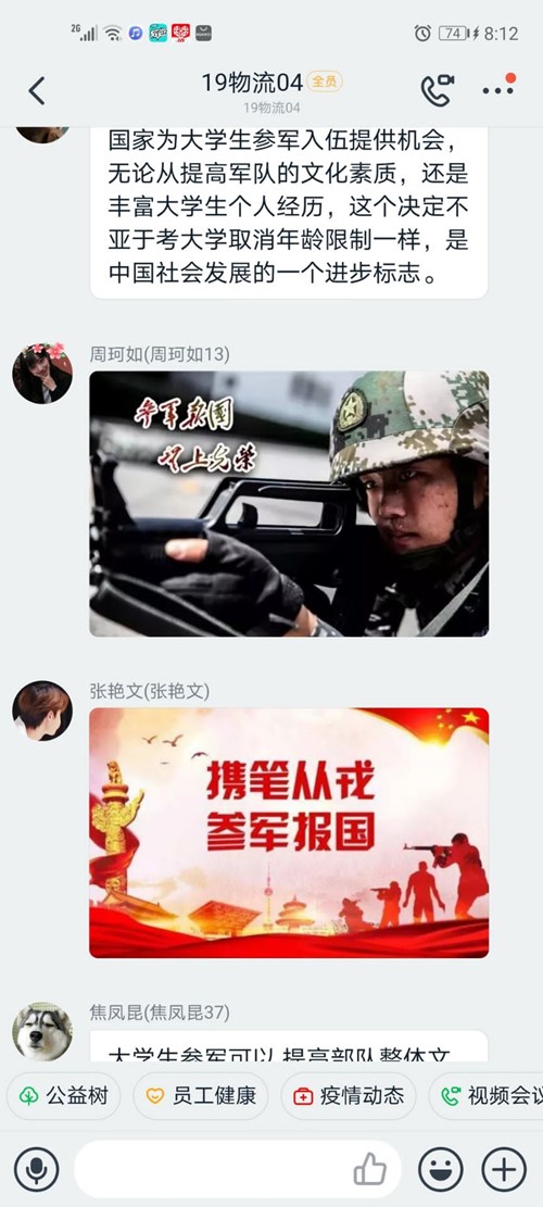 为带领我院学生学习2020年大学生参军政策,培养学生参军报国的意识,6月11日晚上7:30,太阳集团tyc234cc各班团支书组织本班人员在各自钉钉群内举办以“参军报国,逐梦青春”为主题的团课活动。