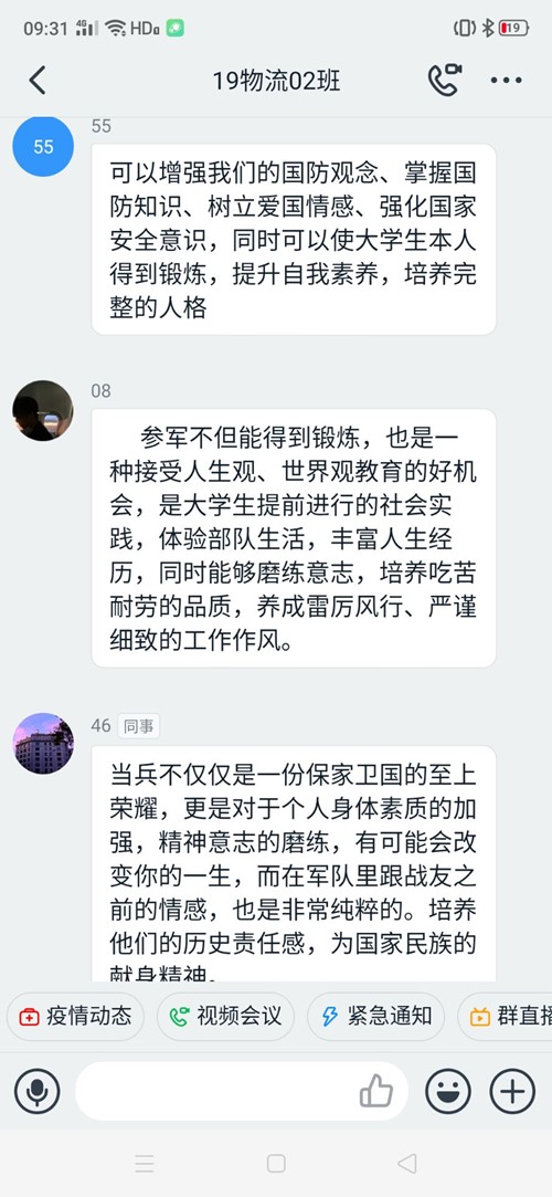 首先,各班主持人展示了2020年大学生参军的相关政策,让大家了解国家对大学生参军的需求。《宪法》规定:“保卫祖国、抵抗侵略是中华人民共和国每一个公民的神圣职责。依照法律服兵役和参加民兵组织是中华人民共和国公民的光荣义务。”接着,主持人为大家播放了许多央视的光荣军人视频,让大家了解到身为中国军人需承担的责任、使命以及光荣。随后,主持人让同学们就观看的政策截图和视频展开讨论。大家一致认为:“颜值的青春在军营,升值的年华在报国。”随着时代的前进,科技和知识的较量最终体现为人才的较量,而高校大学生就是高技术人才队伍的主体。大学入伍是国防现代化建设的需要,是高素质兵源成为军队建设的迫切需要。