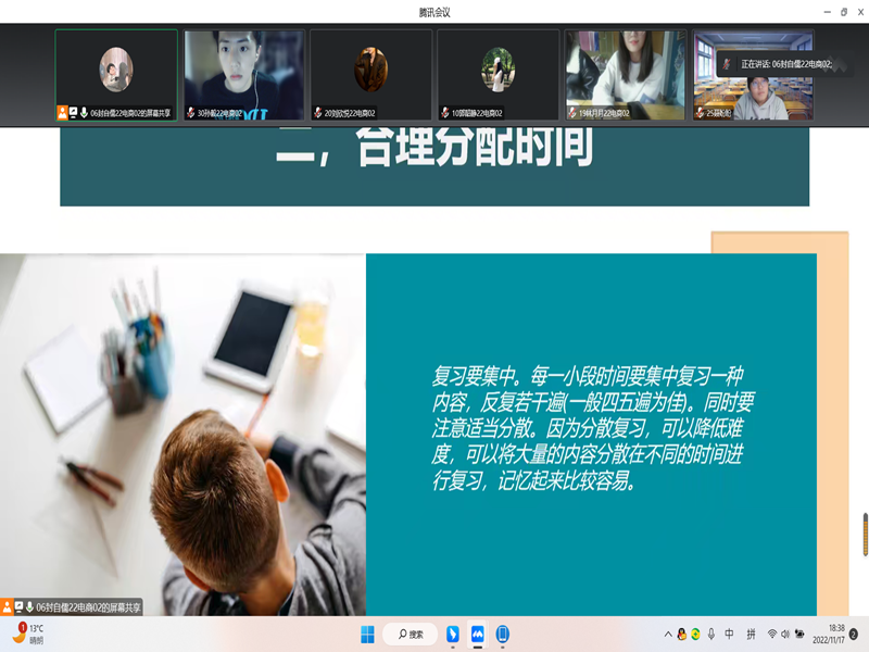 团课伊始,团支书首先提出了当下学生网课学习的现状及临近期末考试学生压力大等问题,由此引出本次团课目的,针对这些问题,同学们积极进行讨论,并分享了自己的经验。同学们根据自己的经验为期末复习给大家提出了不同的建议:对于思政类课程,在复习备考阶段,利用每天的零碎时间进行背诵,不仅能实现时间的高效利用,更能加深理解、巩固记忆;对于英语课程,熟练掌握课件中的概念是复习的重点,在时间充裕的情况下,整理出一份自己的复习笔记,是串联知识点和巩固记忆的好方法;对于数学类课程,通过多加练习提升熟练度是一个有效的方法,做题的时候,要带有自己的思考,不要过分依赖答案;对于专业课程,除了参考老师提供的课件,还可以自行上网搜索相关领域的学习资料;对于专业性比较强、在网络上参考资料较少的课程,可以查找与之相近学科的资料作为补充。在团课最后,学委宣布成立“学习互助小组”来有效化解团员青年学业困难,团支书号召全体同学积极参与,分享学习经验。此外,班长号召各宿舍团小组充分发挥组织功能,积极营造宿舍优良学习环境、和谐互助氛围,发挥带头模范作用,互帮互组共同进步。