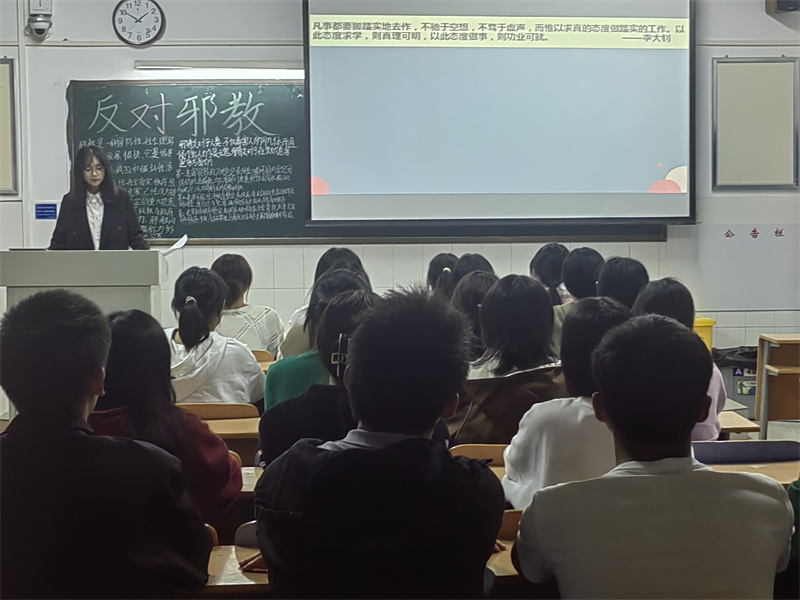 通过这次反邪教主题团课的学习,同学们意识到作为21世纪的知识传播者,科学是战胜邪教的最强大的武器,尊重科学、相信科学,运用科学解决现实生活中的各种问题,树立正确的人生观和无神论思想,用知识揭示愚昧,用行动实践文明,坚决向邪教说“不”!