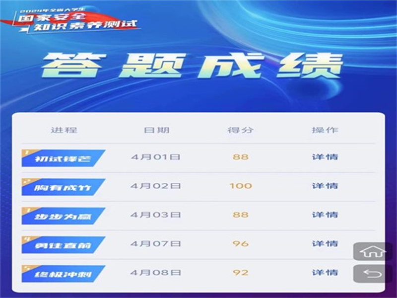 学生通过微信公众号,在4月1日–4月3日、4月7日–4月8日进行线上答题。题目涉及的法律法规包括国家安全法、国防法、反分裂国家法、反间谍法、反恐怖主义法、数据安全法、生物安全法、网络安全法、刑法关于危害国家安全犯罪的规定等。此次答题活动充分调动了学生的积极性和主动性,把国家安全知识素养测试活动与“4·15”全民国家安全教育结合起来,让学生在活动中提升国家安全意识,掌握国家安全知识,自觉维护国家安全。