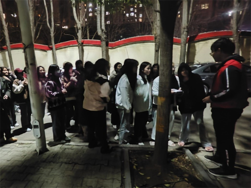 活动伊始,为确保学生们的人身安全及活动开展的顺利有序性,由四号楼的各层层长配合我部人员参与组织此次消防疏散演练。全体学生在层长的指挥下,紧张而有序地开始疏散。一楼的学生在听到指令后,直接前往疏散地点;随后二楼和三楼东、西两侧的学生提前五分钟在中间楼梯口进行排队,并分别从东楼梯和中楼梯撤离;四楼、五楼和六楼的学生最后疏散。所有人员都保持安静、压低身体、用湿毛巾捂住口鼻、快速有序地疏散。活动最后,全部学生在餐厅旁小路疏散点进行集合。