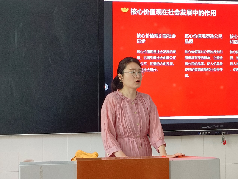 团课伊始,刘老师直接进入此次团课的主题,向入团积极分子讲述了社会主义核心价值观的构成,并要求他们树立正确的价值观,使入团积极分子更加认识到了核心价值观的重要性。随后,刘老师指出错误的思想,并特别强调了作为入团积极分子要坚决反对宗教信仰,以及不信教不传教的重要性,她从《周初除三害》这部电影中详细的讲述了宗教对人们心灵及精神的危害。团课最后,刘老师阐述了奉献精神的定义、内涵及价值,鼓励入团积极分子要勇于奉献,刘老师还播放了几个关于奉献精神的视频,激发了入团积极分子的奉献精神。