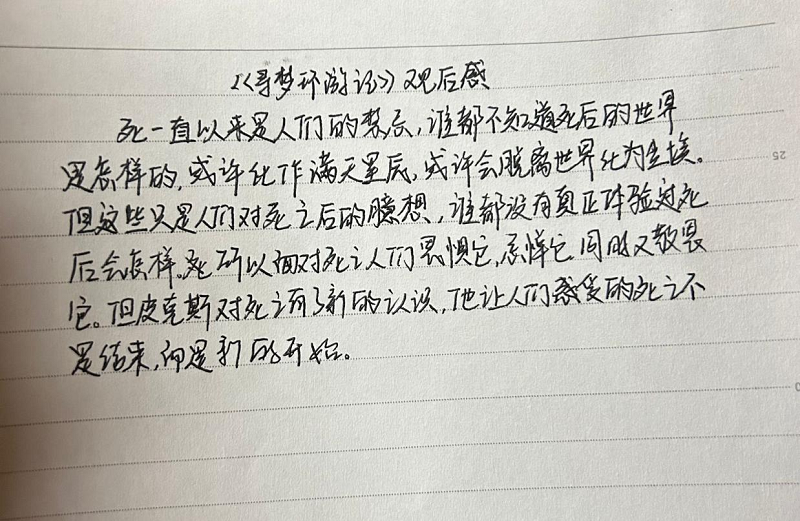 活动伊始,各班心理委员布置现场,准备需要放映的电影《寻梦环游记》,组织同学们有序入座,确保每位同学都能参与到观影活动中去。活动期间,同学们认真观看电影并把自己的想法记录下来,电影是一种浓缩的艺术表现形式,在这部影片中不仅仅有梦想与亲情,也有对死亡的另一种新阐释,通过一种更温情的方式让大家去认识死亡,告诉我们死亡有时不是分别,是一种相聚。整个观影过程中,同学们的心灵受到了升华,对心理健康的重要性有了很大的认识。活动结束,各班心理委员收取同学们的观后感,并组织同学们有序离场。