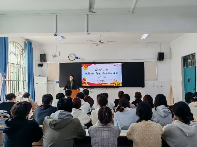 团课伊始,刘阳指出身为一名入团积极分子,应当践行核心价值,积极弘扬奉献精神, 同时结合学生班级管理工作,教导身为学生干部的同学们不可因职位而自高自大,当出现问题和矛盾时,也不能只听信他人一面之词,而应当辩证分析,通过多方调查,听取多方的意见,保持自己的判断意识,客观解决问题。随后,刘阳结合自身学习工作经历,为学生们阐述了“付出总有回报,努力就有成效”的道理,希望学生们能够追求卓越而不自满,不被他人左右自己的思想和目标。最后,刘阳给予学生四点期望:一要多掌握些技能,为后续的职业生涯拓宽道路;二要多参加比赛,丰富自身阅历;三要多阅读,提高自身的文化素养;四要多社交,适应不同的场合,有助于学生打开心胸,保持良好心态。学生们听后纷纷表示不会辜负老师期望,会持续践行核心价值观,培养自身奉献精神。