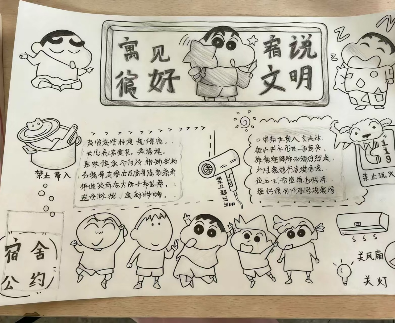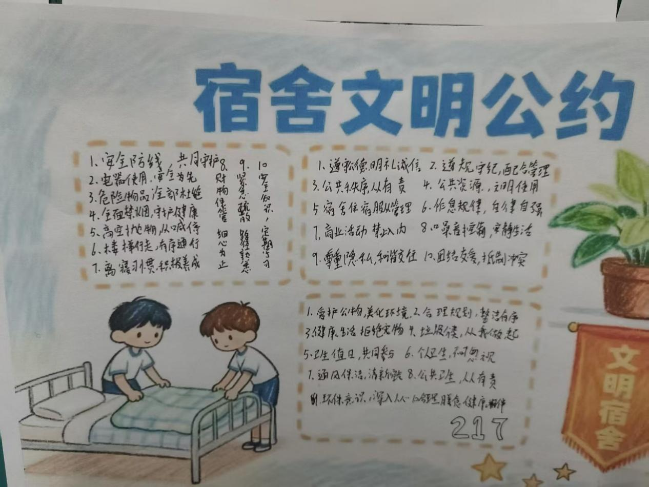 活动启动以来,各班积极行动,组织本班宿舍参与创作。参与宿舍以手抄报等形式,围绕安全、人际、卫生核心条款,补充作息协调、卫生分工、互助约定等个性化内容,手绘自制宿舍文明公约,作品主题鲜明、排版美观,尽显积极向上的宿舍温度。完成创作后,参与宿舍将手绘公约张贴于宿舍门显著位置,让文明约定成为日常行为的“小提醒”;未参与创作的宿舍也下载并打印公约张贴,确保文明意识覆盖每一间宿舍。学生骨干认真收集参与同学的姓名、学号信息及公约张贴照片,按要求整理提交,保障活动有序推进。