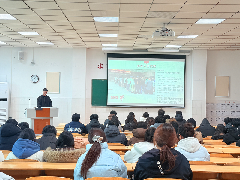 为进一步激发我院学子参军报国的热血情怀,鼓励广大青年学子投身国防建设,12月11日,学院组织开展国防教育暨征兵政策宣讲会。各班学生代表、有意向参军入伍的学生等参加宣讲会。