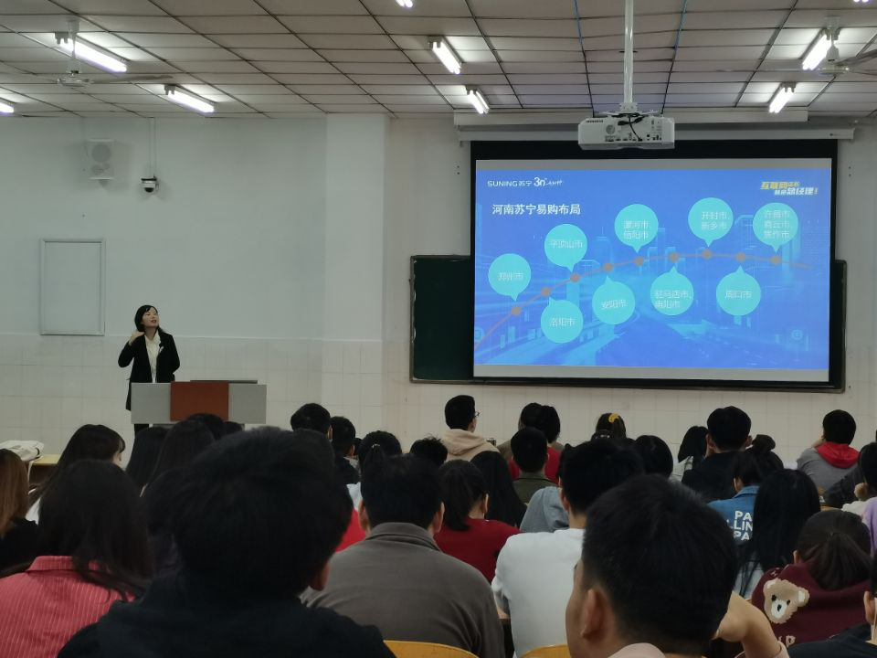首先苏宁易购赵经理向同学播放了关于介绍苏宁企业的视频让毕业生对公司进行简单的了解,然后负责人向同学们提问了与苏宁企业相关的几个问题和现场同学进行互动,其次苏宁企业负责人王冬梅通过PPT对苏宁企业的创立时间,分布、发展历程、未来规划、招聘岗位等进行了详细的讲解。据了解,苏宁企业创业于1990年,在境内外具有两家创业公司,产业布局零售、地产、金融三大板块,其中,苏宁易购连续四年上榜(财富)世界五百强。河南苏宁易购通过15年的拓展,已完成省内的全部地级市及80%的县级市场覆盖。河南苏宁易购已拥有航空港物流基地等三家物流基地。而且,苏宁企业的业态族群丰富多彩,还有多样化的员工活动和显著独特的优秀企业文化。未来苏宁易购将对互联网化,智慧科创等四个方面进行更加深入的规划。此外,苏宁互联网店长工程是苏宁自主培养新时代零售店长的人才工程,此次的招聘岗位名称为易购、家乐福互联网店长,而且做了一些招聘要求的介绍。最后,进入互动环节,现场毕业生对自己不明白的问题向招聘负责人进行了询问,招聘负责人对毕业生提出的问题都进行了一一详细的解答。至此,本次招聘会圆满举办。会后,有意向求职的同学纷纷将个人简历交给了企业招聘负责人,并对这些学生进行了面试和选拔。