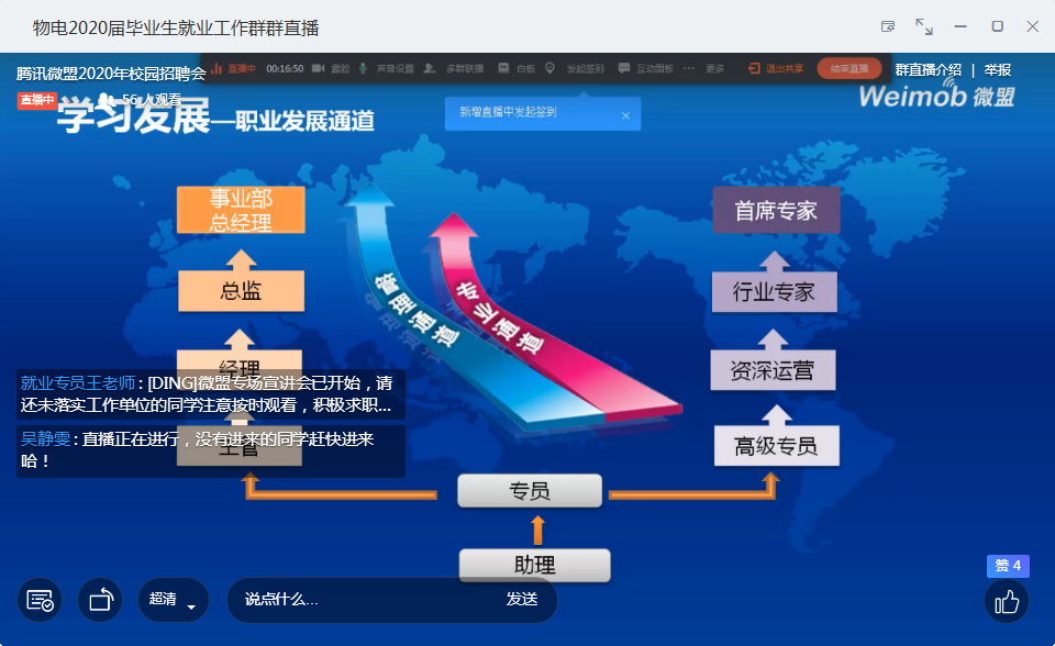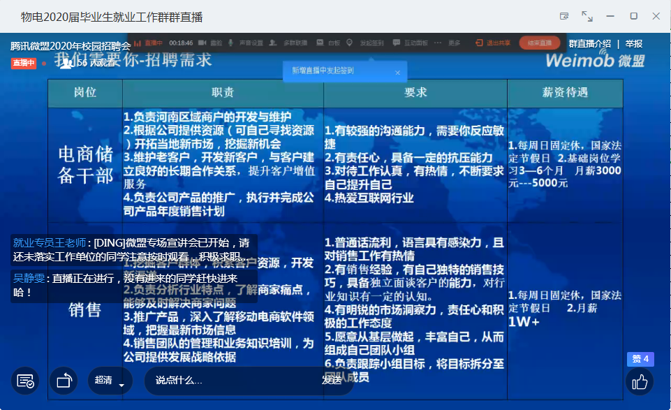 为帮助尚未落实工作单位的毕业生在离校前找到心仪工作,5251430,太阳集团tyc234cc在毕业生钉钉群内以直播形式开展了腾讯微盟2020年校园专场宣讲会。宣讲会由腾讯微盟郑州分公司人事经理张蓓主讲,我院六十多位毕业生观看了宣讲会直播。