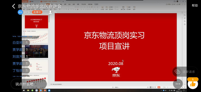 为切实做好毕业生就业创业服务工作,加强我院与企业联系,让毕业生更加深入了解职场信息,明确自我就业方向,11月18日晚七点,我院于钉钉会议群组织开展京东物流华北分公司企业线上专场宣讲会。参加本次宣讲会的有京东物流华北分公司招聘负责人、2021届毕业生以及我院就业创业服务中心工作人员。