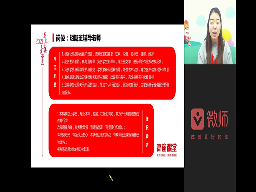 求职毕业生通过扫码进入高途课堂牧院专场招聘群。招聘官曹雨倩通过群公告,提醒大家此次空中宣讲会需要提前网申报名,并依次给投递简历的毕业生发送此次直播链接。据了解高途课堂是跟谁学旗下专注于中小学在线教育品牌。跟谁学是中国第一家在美国上市的在线教育公司,是目前全球市值最大的在线教育机构,公司发展潜力巨大。高途课堂采用目前十分新颖的名师授课+双师辅导的在线直播双师模式。受知识付费这一时代大洪流影响,科技让教育更美好是高途课堂提出的使命,吸引大量专属用户。招聘负责人非常耐心解答同学们所提有关公司前景、薪酬福利、上升渠道等问题。此次招聘会所提供岗位为 "星途计划”—长期班辅导老师以及短期班辅导老师,入职即缴纳六险一金,工作环境轻松愉悦,员工福利优越。宣讲会结束后,随即对求职者进行线上面试。