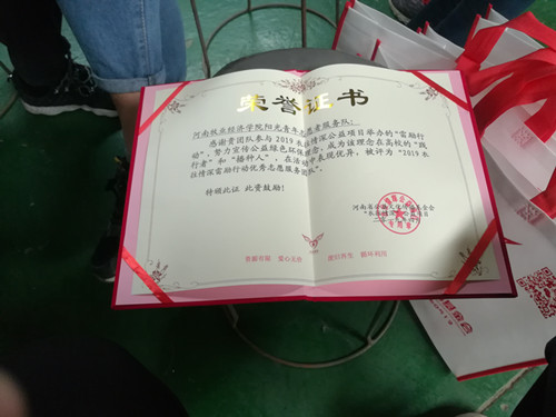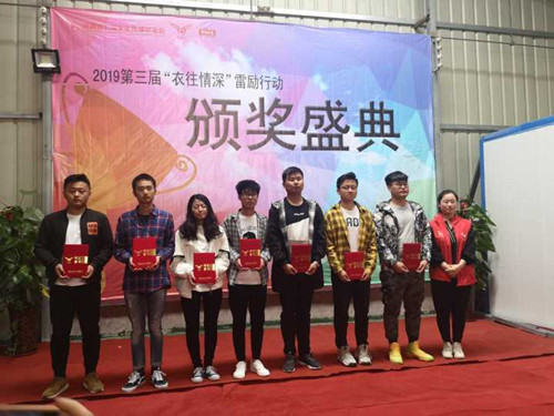 2019年4月20号上午10点,“衣往情深”雷励行动颁奖典礼暨“中原更出彩,公益我先行”在郑州市中牟县“衣往情深”基地进行。太阳集团tyc234cc阳光青年志愿者协会荣获2019“衣往情深”雷励行动——“优秀志愿服务团队”光荣称号。