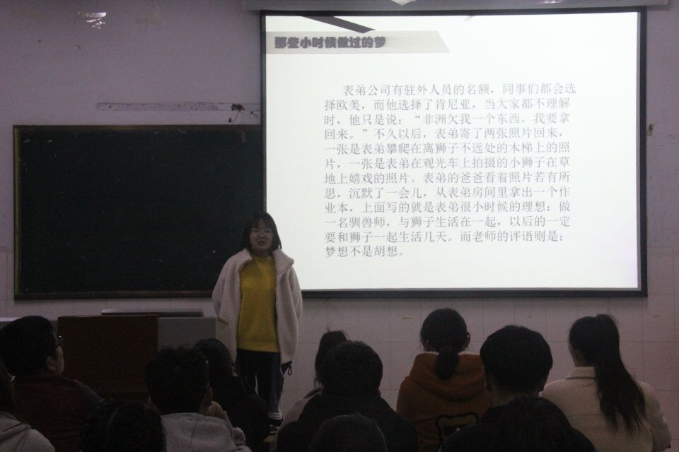 参与宣传的人员分别是:17级电商一班和佳美、17级物流电商夏文欣、17级物流管理01班张孝文、17级物流电商王鑫雨等8位学生。他们的宣讲内容为自己的梦想和追梦之路,以此来表达自己对梦想的理解。其中,17级电商一班的和佳美同学以《有梦不难 努力去闯》为题,讲述了自己对偶像的追梦成长故事,以此来表达梦想对人生的重要性。梦想是我们成长的动力,实现梦想的过程可以决定一个人的命运。首先,她将中国的过去与现在相对比,运用了习近平主席的话来表达了中国梦的实质。接着,她例举实现自己小时候梦想的过程为事例来表达:小时候的梦应该勇敢实现。在演讲最后,她希望大家可以用青春去奋斗,用努力去实现梦想。接下来17物流电商夏文欣以《脚踏实地方可仰望星空》为题,他提到:每一个人对幸福的理解不同,但每个人都在追求幸福。在演讲过程中,他的暑假支教经历让他懂得如何去奉献爱心,同时也表达了希望大家在绝望的时候应更努力拼搏,不放弃,做自己路上的追梦人。在宣讲结束后,每一位同学都对宣讲团人员演讲的不足之处提出了建议和意见,同时主持朗诵队人员也对其进行了指导与培训,宣传员们也表示他们会改正不足之处,继续完善自我,带给大家一个更完美的演讲。