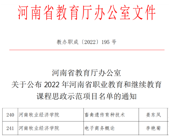 日前,据《河南省教育厅办公室关于公布 2022 年河南省职业教育和继续教育课程思政示范项目名单的通知》(教办职成〔2022〕195 号),我校姜东凤副教授团队的《畜禽遗传育种技术》、李艳菊教授团队的《电子商务概论》被确定为继续教育课程思政示范课程。根据文件,入选示范课程相应授课教师、团队为河南省职业教育和继续教育课程思政教学名师和教学团队。
