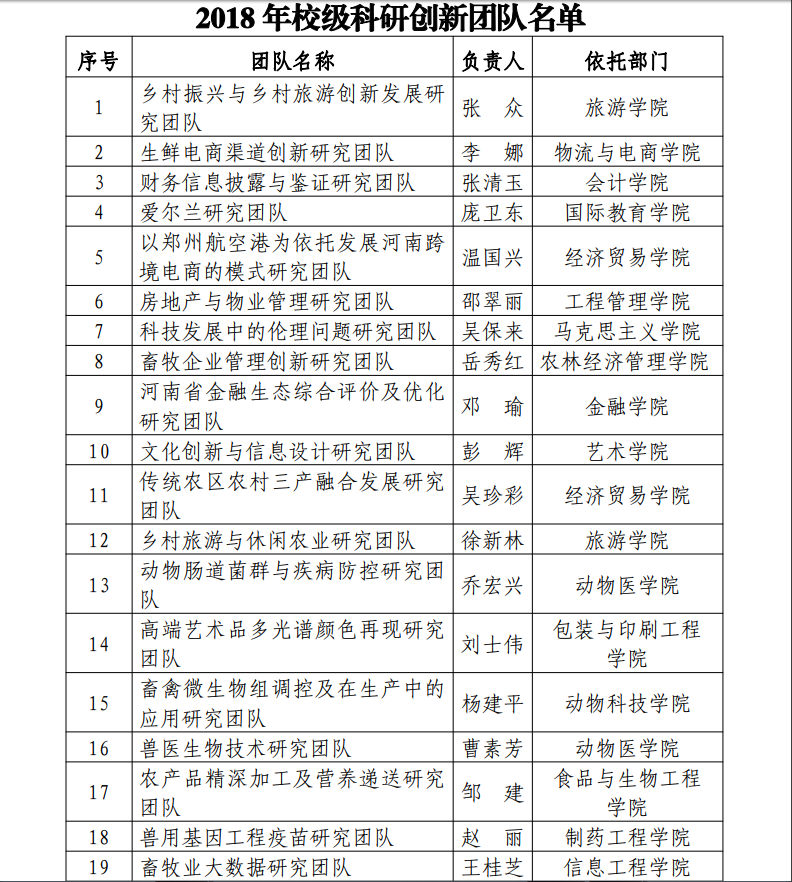 根据《太阳集团tyc234cc科研创新团队管理办法(试行)》(校政〔2018〕3 号)精神,我校组织开展了 2018 年校级科研创新团队遴选工作。在个人申报、科研处初审、学术委员会评审的基础上,经学校研究,决定立项建设“乡村振兴与乡村旅游创新发展研究团队”等 19 个校级科研创新团队(详见附件),现予以公布。各团队要严格按照学校相关文件要求,围绕团队研究方向,确立目标、加强管理,确保在建设期内完成规定考核指标,不断强化学校科研队伍建设,促进人才培养,提升学校科研服务社会能力,推动学校学术进步和科技发展。