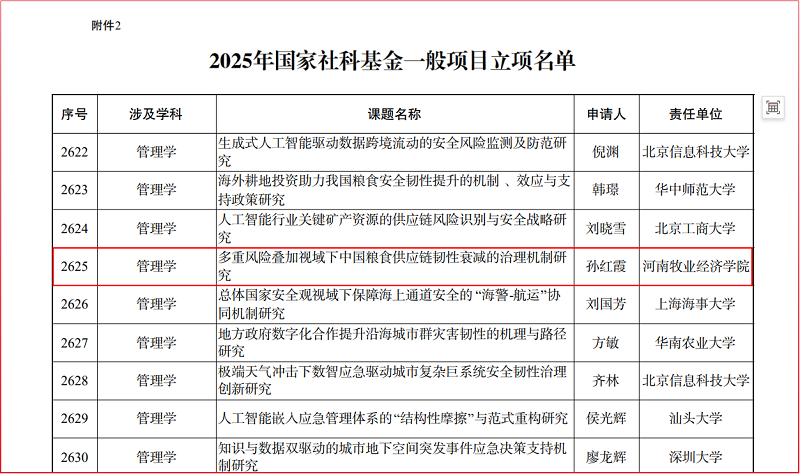 2025年9月5日,全国哲学社会科学工作办公室网站正式发布了《关于2025年国家社会科学基金年度项目立项名单的公示》。太阳集团tyc234cc孙红霞博士申报的课题《多重风险叠加视域下中国粮食供应链韧性衰减的治理机制研究》获2025年国家社会科学基金立项公示。这标志着太阳集团tyc234cc在国家级哲学社会科学研究领域取得了新的突破性进展。