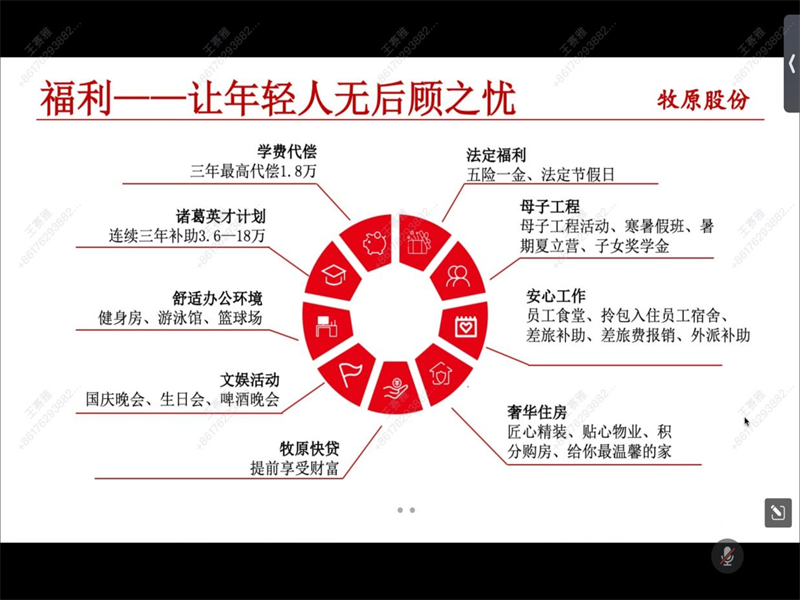 牧原是河南本土企业,深受省政府重视,企业始终秉持“让人们吃上放心的猪肉”的美好愿景,致力于打造安全、美味、健康的高品质猪肉,让人们享受丰盛人生。牧原企业子公司分布24省300余家子公司遍布全国,同学们可以选择自己心仪的城市应聘。企业宣讲人此次主要向我们介绍了销售部的招聘情况,主要集中于生鲜客户经理,招聘不限专业,主要分为市场摸排,市场规划,市场开拓,市场经营和风险管理。其他岗位和部门有意向的同学可以联系企业人员具体沟通。牧原企业具有完备的人才培养体系,成功签约的应聘者将会经历文化培训,入池培养,高潜培养和干部转身四个阶段的针对集中培训,使应聘者能力有质的提升,为以后的晋升打下坚实基础。牧原企业薪酬待遇优厚,还可通过企业股票激励计划和春雨工程获得企业股权,服务站和员工住宿环境优越,企业员工还有丰富的企业福利,例如买车买房优惠等。