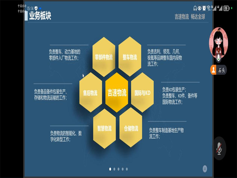 会议开始,宣讲人首先简单介绍了公司的发展历程和产业布局:吉速物流隶属吉利集团旗下,全称吉利集团物流与备件中心,主要负责吉利汽车集团物流体系全面建设工作,是集团物流运营管理归口单位,2019年注册独立公司主体——浙江吉速物流有限公司,同步从企业物流向物流企业转型。吉速物流以融合、聚力、高效、智慧为发展战略,是一家集现代运输、配送、仓储、包装、产品流通以及物流信息于一体的综合性物流企业。接着,宣讲人介绍了吉速的企业文化,和企业的营业范围,包括零部件入厂物流、整车物流、国际物流、售后物流等。并为我们展示了公司的员工餐厅、宿舍和生活配套设施,企业提供有餐费补贴、住房补贴、交通补贴、入职培训、五险一金和节日福利等福利待遇。本次招聘会招聘物流管理等理工类专业人才,负责收发,分拣货物等物流方面的工作。最后,负责人耐心解答了同学的问题。