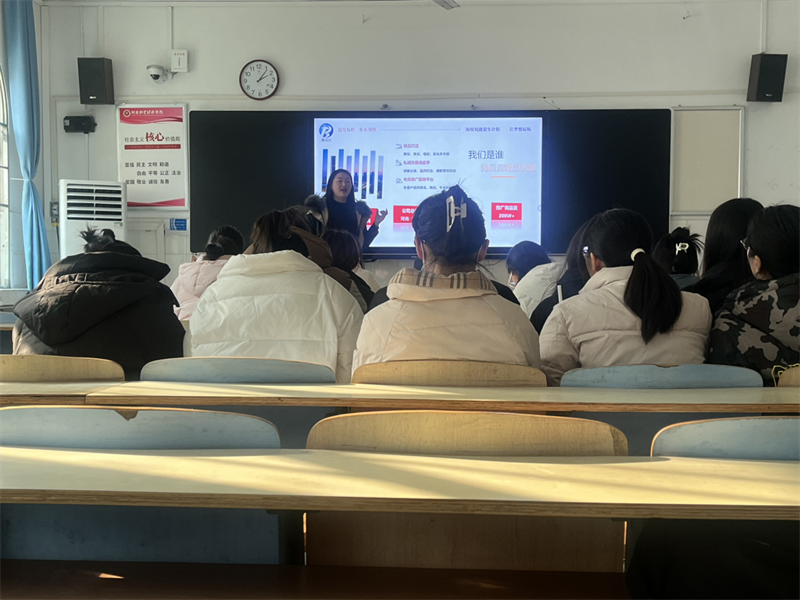 会议开始之前,企业招聘负责人给在场的毕业生发放了企业宣传页,帮助毕业生对该企业有一个大致的了解。接着,主讲人伯乐爱以PPT的形式展示了企业的相关信息及岗位介绍。淘贝贝是河南郑州的一家本土企业,多年来一直致力于电商领域,具备年轻化有活力的工作团队、完善的培训晋升机制和优渥的福利待遇。此次的招聘岗位为电商推广和渠道维护,主要包括与各商家负责人对接工作、进行流量渠道开发和产品营销等,工作地点在郑州市高新区电子商务园区。薪资方面,毕业生在实习期间可得到每月无责底薪4000左右,转正之后为5200每月加提成,同时享有六险一金、带薪年假、内推奖、创新奖等福利。学生们在宣讲会期间表现出极大的兴趣并与主讲人积极互动。会议最后进行了互动问答环节,伯乐爱女士耐心回答了毕业生的疑问并鼓励他们投递简历,随后在现场进行了面试。
