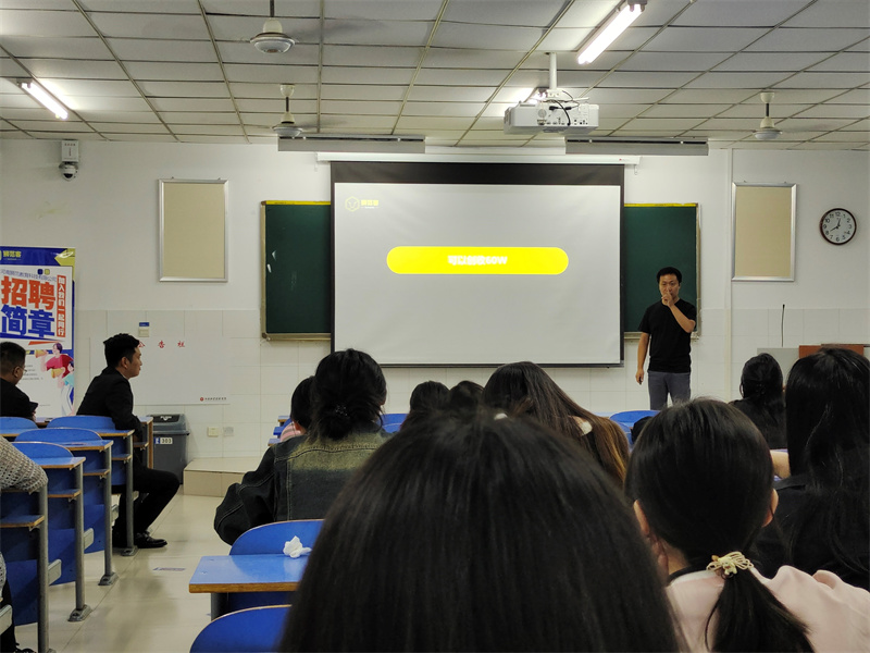 会议伊始,狮范客曾庆林经理从为什么,我可以吗两个方面引入宣讲。曾经理首先向大家展示了范客教育科技有限公司的发展历程和企业宗旨,让同学们对企业有了初步的了解。随后,曾经理借助PPT向同学们介绍了此次宣讲会的招聘岗位:新媒体运营、短视频运营、抖音运营、直播电商运营五个方向,并一一介绍了每个岗位的职责与要求,并表示此次招聘岗位正与大学生人群相适应,公司福利多样,薪酬待遇优厚。随后又杜先生在招聘微信群内发布线上笔试题,并表示第二天上午进行笔试,下午进行面试。会议最后,杜老师对同学们提出的疑问进行了一一回答,宣讲会取得了圆满落幕。