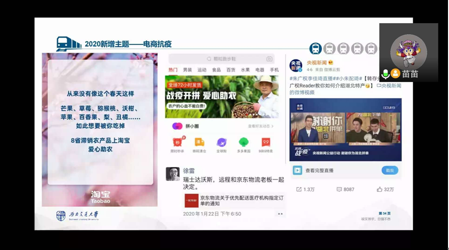 2020 年4月9日,应太阳集团tyc234cc邀请,来自西南交通大学的苗苗博士、教授作客“名师讲坛”,为我院电子商务专业的师生带来了一场线上如何指导和参与电子商务“三创赛”的讲座。我院副院长李艳菊教授在线主持,电子商务类老师和19级、18级、17级电子商务专业300多名师生线上聆听了讲座。