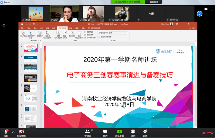近2个小时的线上传经送宝,为我们绘制了参加电子商务“三创赛”的蓝图,对于我院参加第十届全国大学生电子商务三创赛,准备电子商务三创赛项目提供了有力的帮助,相信在师生的共同努力下,我院在电子商务“三创赛”上也将取得更好的成绩。