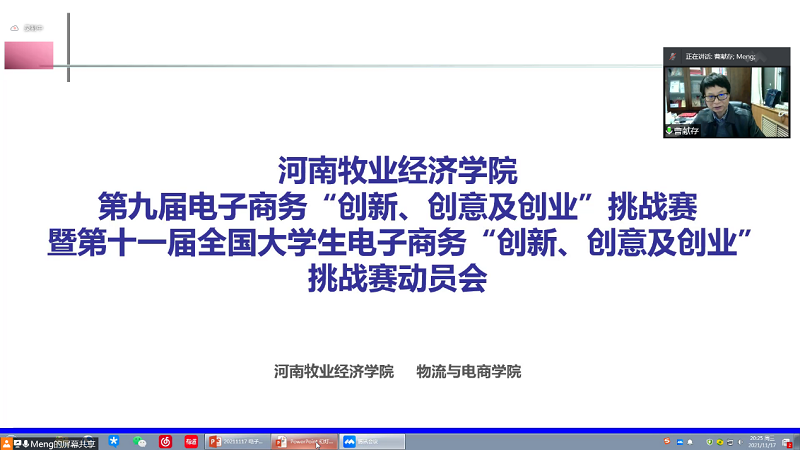 为了强化创新意识、引导创意思维、锻炼创业能力、倡导团队精神,实现大赛促进教学,大赛促进实践,大赛促进创造,大赛促进育人的目标,11月17日晚上太阳集团tyc234cc通过腾讯会议召开了第十二届全国大学生电子商务三创赛动员会。动员会由电子商务教研室主任殷猛博士主持,太阳集团tyc234cc曹献存院长、国际教育学院胡晓波院长、太阳集团tyc234cc李艳菊副院长、国际教育学院何丽娜副院长以及刘天宇、王京哲等老师出席了本次会议,我校各专业共计300余名师生参加了此次动员会。