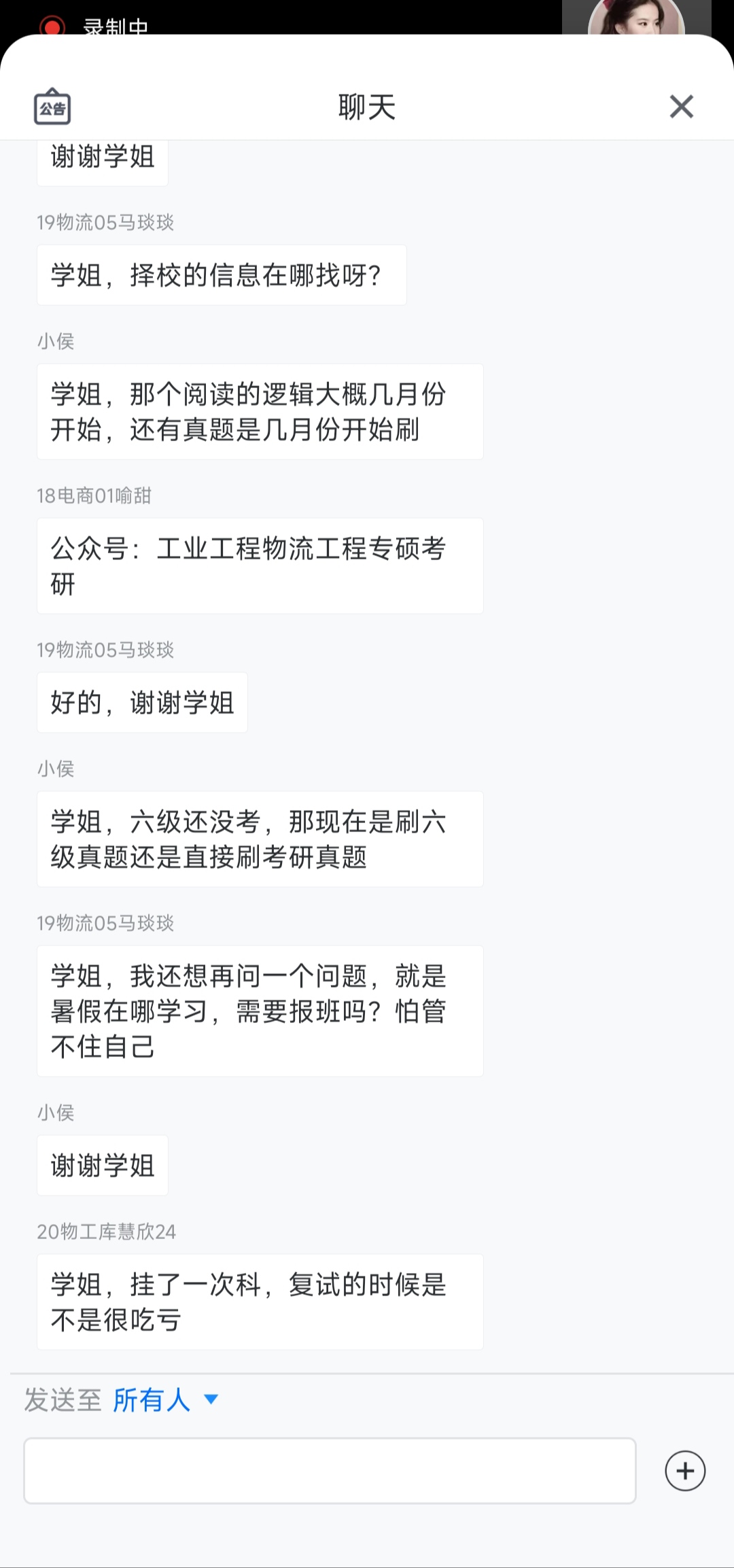 讲座开始前刘阳老师分析了当前的考研形势,分别介绍了参加本次经验分享讲座的三位同学,对参加的同学表示了欢迎和感谢,同时表达了对考研学子的鼓舞和期望。随后,由考入武汉科技大学物流工程与管理专业的朱琳同学进行分享。朱琳同学认为对考研学子来说,做出适合自己的选择是重中之重,无论是选择院校还是专业,都要做好对自己的认知和对学校、专业的了解。其次,分享了自己在考研过程中积累的经验和方法,同时强调高效的方法、沉稳的心态和持续的勤奋至关重要。接着,考入北京工商大学物流工程与管理专业的彭诗佳同学针对考研的科目和题型,为大家分享了自己在考研中使用的学习软件和学习资料,并把学习各种题型的见解和方法进行了详细的讲解,其中着重强调要多刷考研真题,培养做题手感。最后,考入浙江万里学院物流工程与管理专业的喻甜同学通过讲述自己的考研经历,全面地向大家分享了考研经验,首先讲明了选择考研学校和专业的重要性,随后推荐了各学科的考研资料和课程,最后介绍了浙江万里学院的复试内容,使大家对考研内容和形式有了更加全面的认识。三位同学分享结束后,进行了答疑环节,积极对同学们提出的问题进行了详细解答。比如有同学提出“该如何合理规划时间”这一问题,朱琳同学建议要把时间分为暑假前、暑假中和暑假后,目前要打好基础,暑假中要强化对知识的掌握,暑假后进行模考等。
