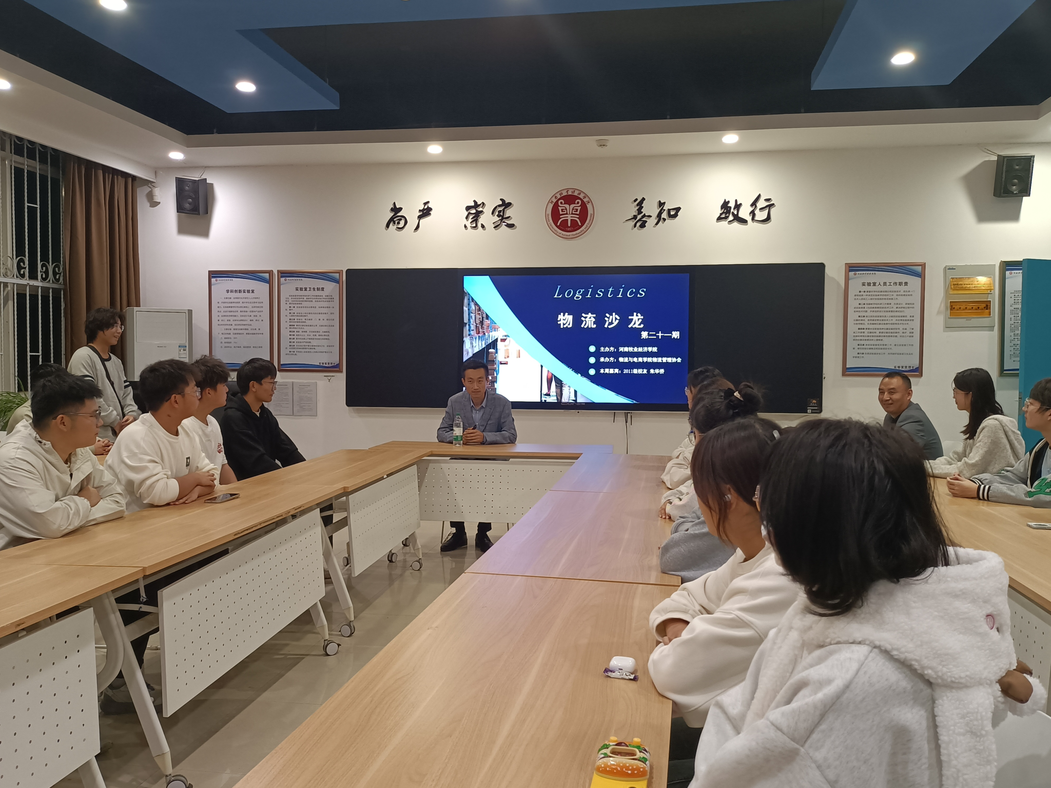 在第21期物流沙龙活动中,朱学长通过PPT向我们讲述了自己实习与就业的经历和贵公司发展的历程,并从生活中常见的现象延伸到冷链技术对物流发展的重要性,介绍了当下物流行业及其所属的郑州华夏易通物流公司的基本情况,又以自身从事物流工作的经历作为切入点,综合分析当下物流行业所存在的问题及机遇,提出了自己的见解。
